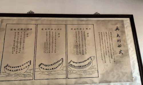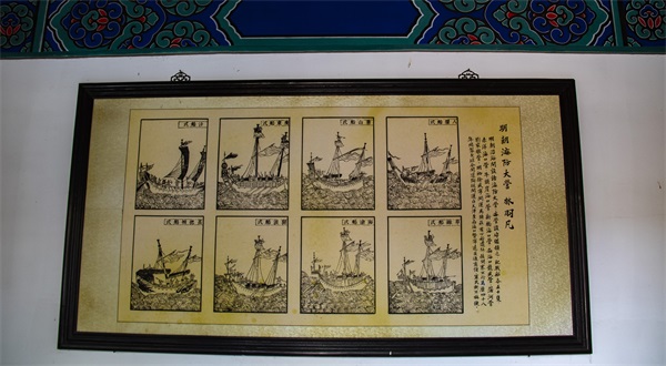 明代后期,朝廷对陆海军事要塞老龙头增派重兵驻防,并加强海上防卫力量,建立水师三个营,战船百余艘,此处战船是根据当时实物所复制。