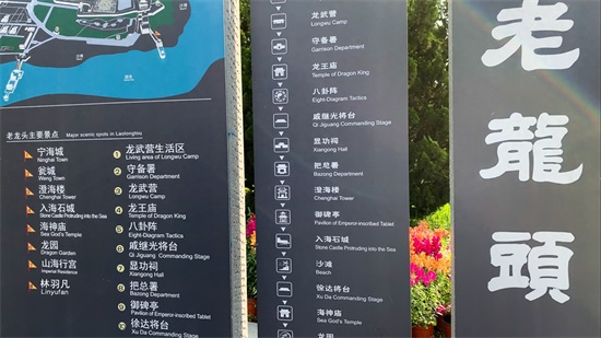 进了检票口之后就能看到有一个景区指示牌,大致能看到老龙头这边的一些主要景点。有宁海城、瓮城、澄海楼、入海石城、海神庙、龙园、山海行宫等,门口的宁海城是进入这些景区的唯一出入口。