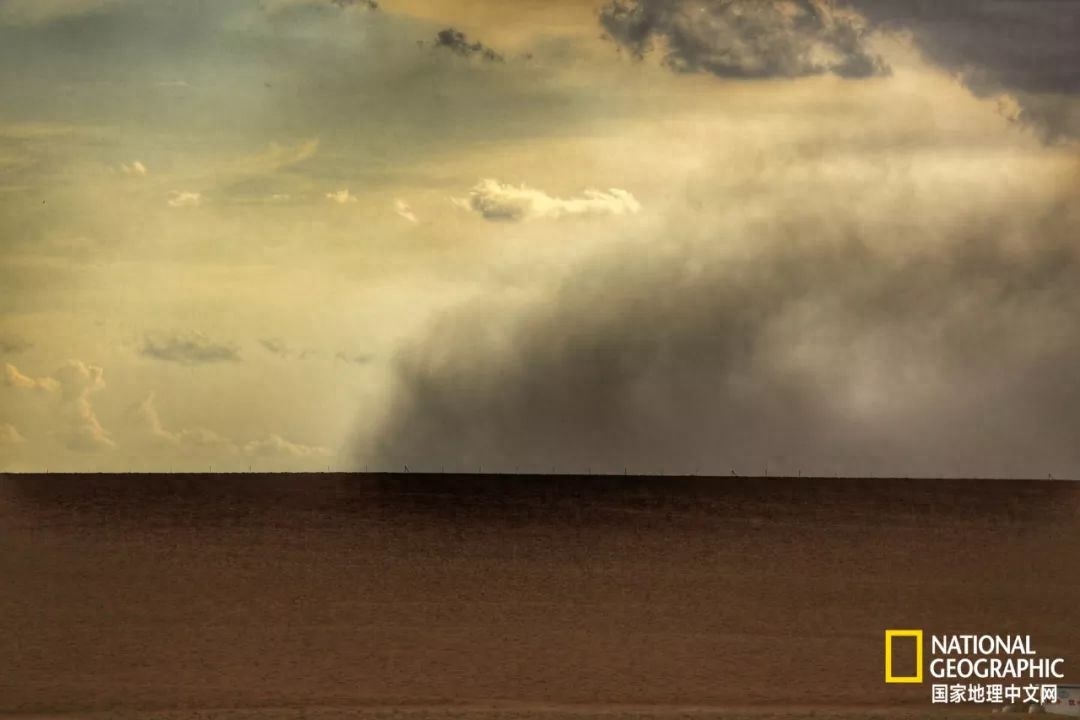 戈壁沙漠时而会遇见沙暴。蓝天一角,狂风骤起,风卷着地上的黄沙,在天地之间翻滚着来袭。