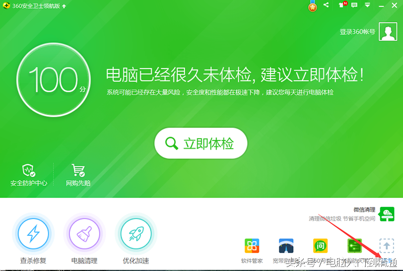 1、首先打开360安全卫士界面,在右下角点击更多,进入到全部工具管理界面。