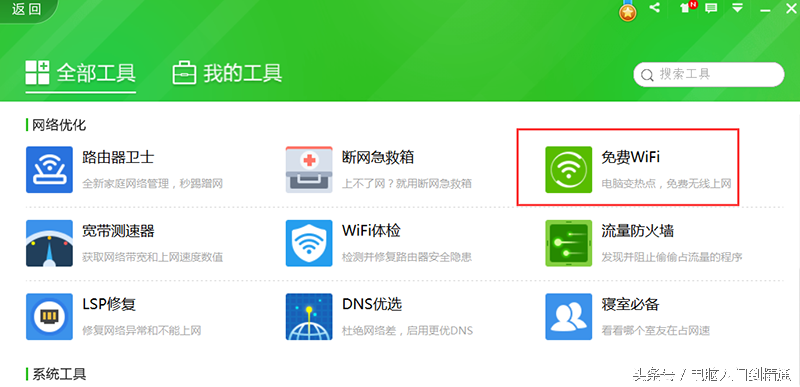 其他同类型的软件像腾讯电脑管家,金山卫士的WIFI共享软件,一般都是在工具箱,百宝箱里找。也是很简单的一键设置。在学校宿舍,出租屋等环境下,你有一台只能用网线上网的笔记本,没有无线路由器,又想手机也能WIFI上网,那就用下这个简单的小办法吧。