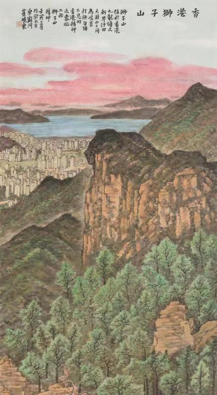 得知能为香港回归25周年而创作,尽管工作繁忙,我欣然参与。这次美术展中,创作人物题材的比较多,而我是画山水的,应该选择什么样的风景来表现香港呢?香港有一座狮子山,它见证着香港由一个小渔村发展为国际化大都市的艰辛历程;而狮子山所代表的艰苦打拼、自强不息的香港精神,鼓舞着几代香港人顽强奋斗。于是,我决定为象征香港精神的狮子山作画。