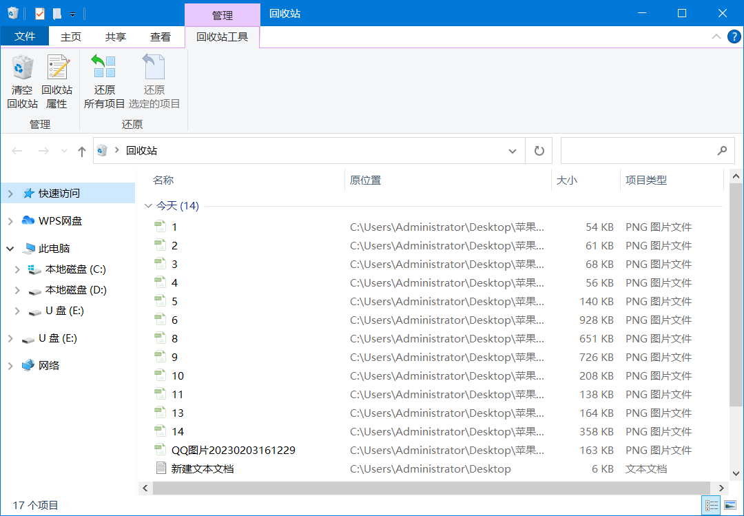 正常情况下,这种删除的文件,一般都会经过回收站。如果想要恢复只需打开电脑的回收站,可以看到要恢复的照片,选中照片,右键快速恢复。不过有个提前是不能在已经清空了的情况下。