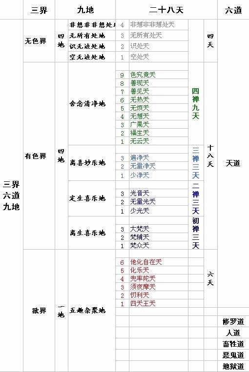 无色界:为“非想非非想处地”、“无所有处地”、“识无边处地”、“空无边处地”。