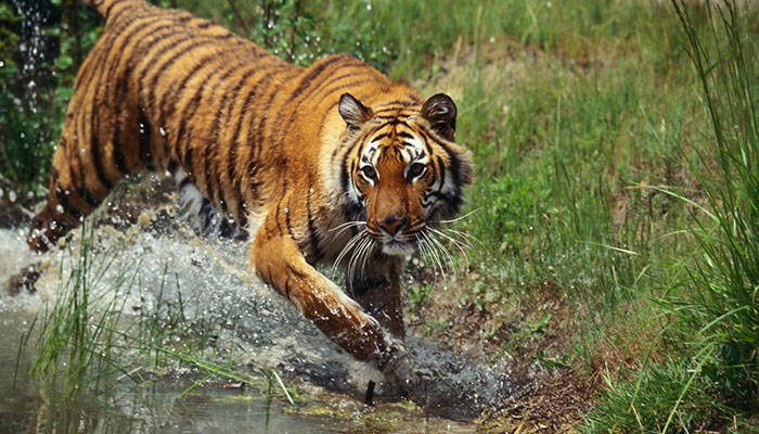 虎的体态雄伟,毛色绮丽,头圆,吻宽,眼大,嘴边长着白色间有黑色的硬须,长达15厘米左右。颈部粗而短,几乎与肩部同宽,肩部、胸部、腹部和臀部均较窄,呈侧扁状,四肢强健,犬齿和爪极为锋利,嘴上长有长而硬的虎须,全身底色橙黄,腹面及四肢内侧为白色,背面有双行的黑色纵纹,尾上约有10个黑环,眼上方有一个白色区,故有“吊睛白额虎”之称,前额的黑纹颇似汉字中的“王”字,更显得异常威武,因此被誉为“山中之王”或“兽中之王”。虎强壮高大,毛色从北而南呈黄色到红色渐变,有深色条纹。不同于狮子吻长所以脸廓狭长的特点,老虎吻部较短,显得头大而圆。