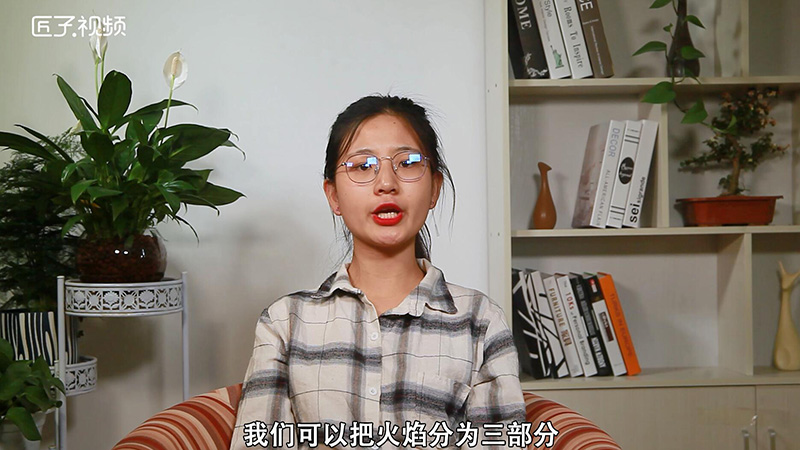 我们通过火焰的颜色可以看出有黄色光和蓝色光,那么黄色光部分呢?由于物质在这个地方可以充分燃烧,所以亮度比较大,光线比较强,这一部分就是温度最高的外焰,而温度相对来说低一点的是内焰部分,这部分物质也可以有效的燃烧,但相对于外焰又弱,所以发的是蓝色光,这样我们可以发现温度最低的就是焰心,由于物质在此处燃烧不发光,且未完全燃烧。