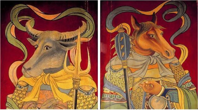 我们再来讲牛头和马面,地狱鬼卒。在民间信仰中,他们是泰山府君(又或阎王、判官)的属下。牛头又叫阿傍、阿防,也有叫牛头阿婆的;牛头人身,两脚牛蹄。而马面又叫马头罗刹、马头鬼;他是马头人身。还有一说,牛头马面本与常人无异,只是审讯时戴上牛头和马面面具。