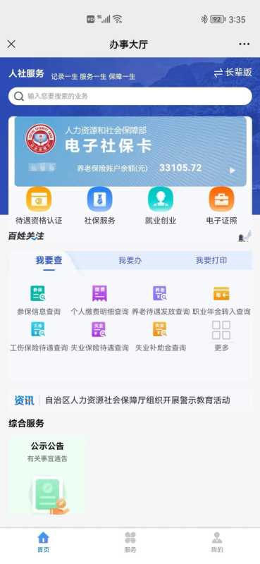 回到“办事大厅”就可以看到电子社保卡有你自己的名字和养老保险账户余额了,可怜只有33000,因为中间停交了很久,不过,交得少是最重要的。