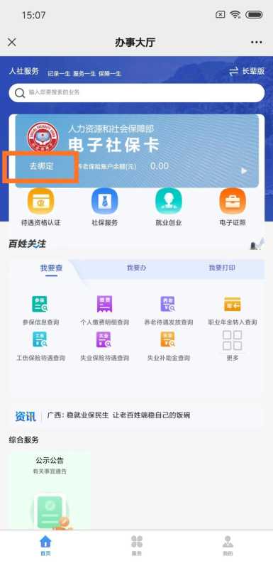 进入广西人社微服务主页之后就是“办事大厅”,此果可以看到有一个“电子社保卡”但是并没有绑定任何账户,我们需要做的就是去绑定你自己的账户,点击“去绑定”