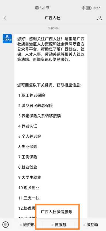 进入“广西人社”公众号面页之后,可以看到底部有一个“微服务”,点击它就会弹出一个菜单“广西人社微服务”,点击进入面页。