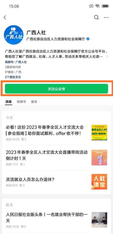 点开“广西人社”公众号之后,再点击“关注公众号”