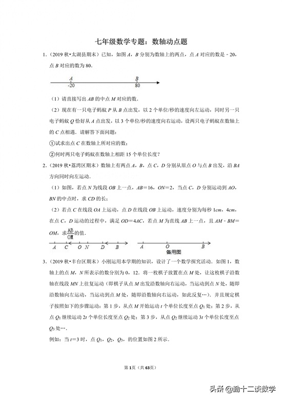 本篇文章主要介绍数轴动点题解题技巧,精选40道数轴动点题,来自本学期月考题,或者上学期期中、期末试卷中的题目。通过40道题目的练习,完全掌握这种类型题目。题目有详细的解答过程,加入圈子或已购买初一数学专栏的可私信获取电子版。
