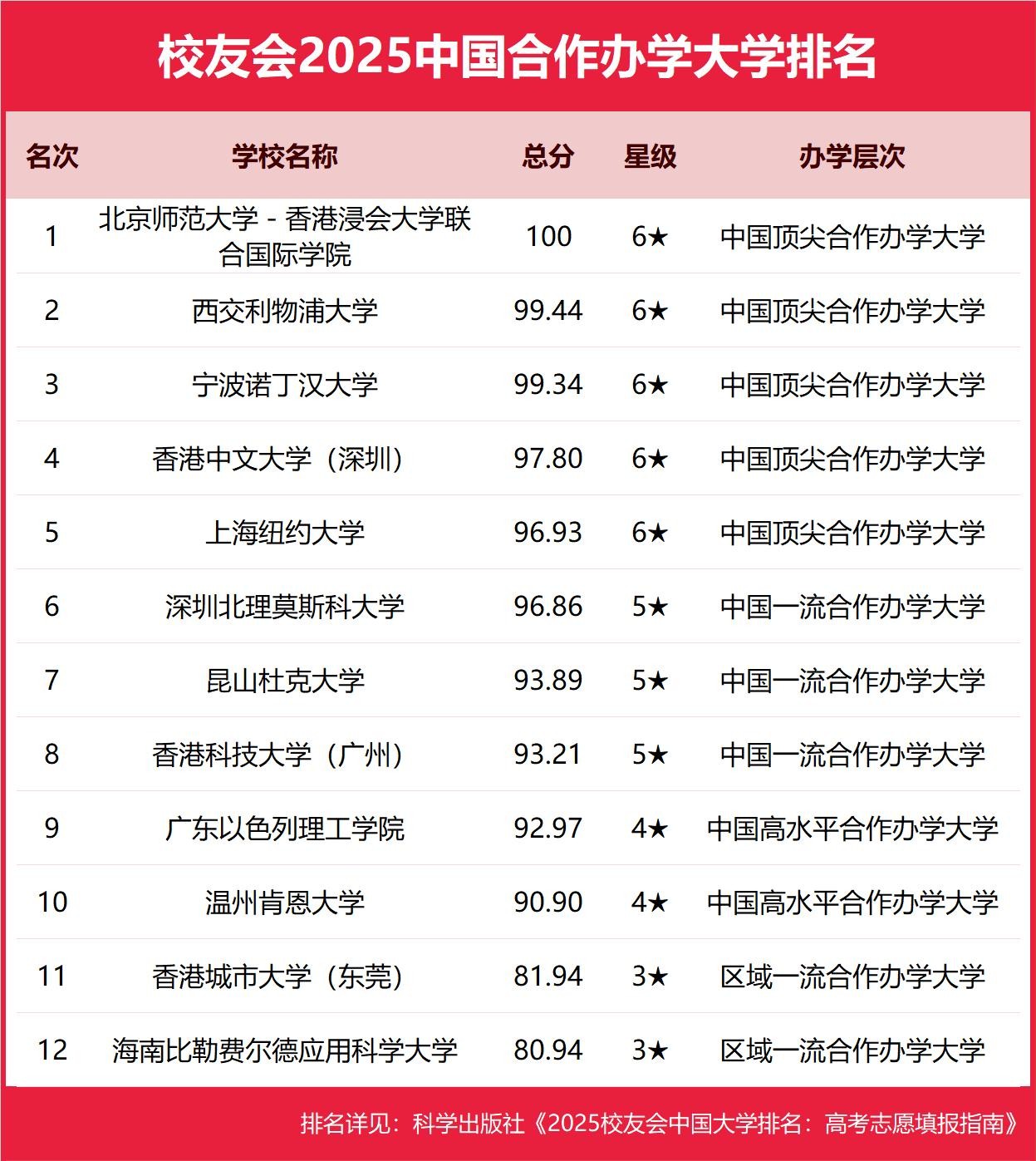 北京师范大学-香港浸会大学联合国际学院问鼎校友会2025中国合作办学大学排名榜首。西交利物浦大学第二,宁波诺丁汉大学第三,香港中文大学(深圳)第四,上海纽约大学第五深圳北理莫斯科大学第六,昆山杜克大学第七,香港科技大学(广州)第八,广东以色列理工学院第九,温州肯恩大学第十。香港城市大学(东莞)第十一,海南比勒费尔德应用科学大学第十二。