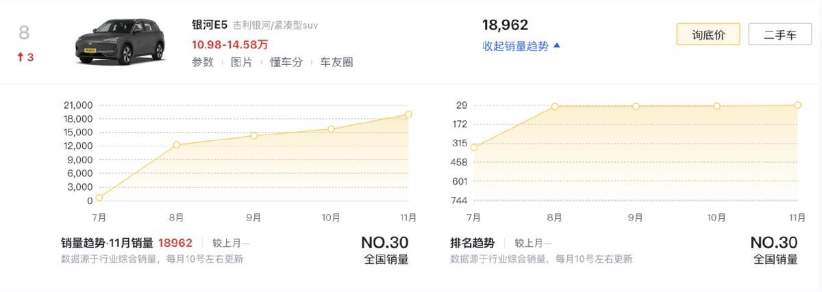 银河E5(第8名)在定位上更像是一台家庭出行的代步工具,它无论是吉利银河OS 2.0,还是短刀电池带来的1.8C快充,虽然都谈不上顶尖,但却能保持行业的中上水平,让用户花更少钱,感受到更多主流用车体验。