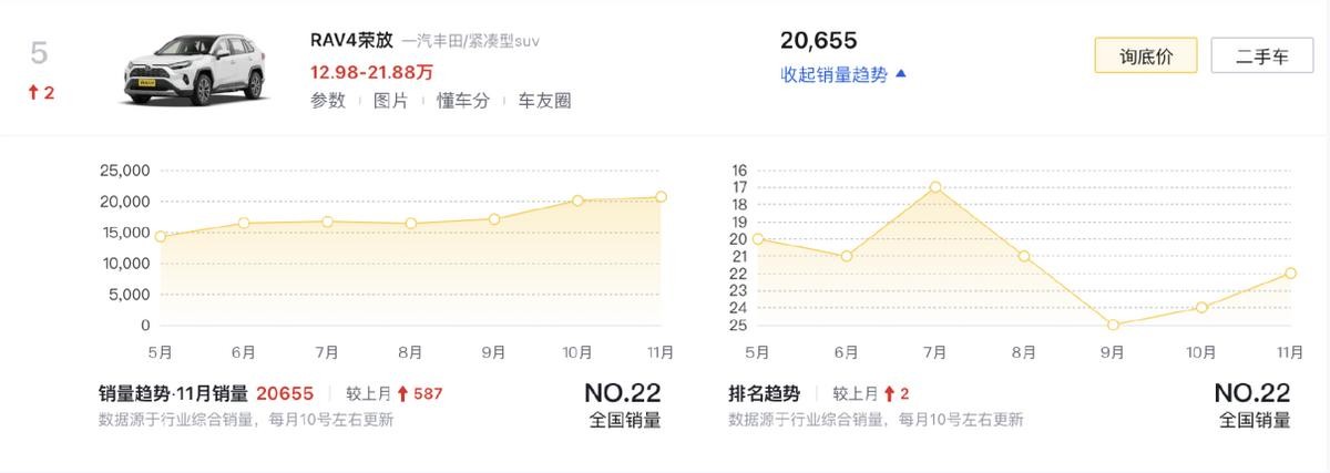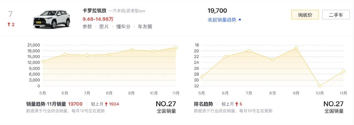 丰田卡罗拉锐放(第7名)是入围TOP10的第二款丰田,作为定位略低于RAV4的选手,它在市场竞争方面主要是为有需求的年轻消费者提供经济可靠的选择,除了与RAV4相同的优势外,它在设计上更年轻化,也能在价格上跟国产车形成直接竞争关系,而且在一些基础互联娱乐功能已经具备后,它也能更好地吸引年轻用户。