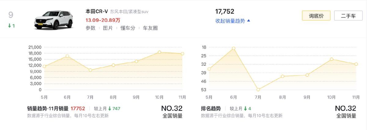 本田CR-V(第9名)虽然稍稍被RAV4拉开了一些距离,但其依旧是不容小觑的合资SUV,而且也是TOP10唯一一款以1.5T发动机为主动力的车型。在完成了上一次迭代后,这台车在内外呈现出的简洁风更容易被家庭接受,锐混动选项可以让用车更经济,而且在提供更多智能互联功能后,它也告别了过去的“中年专属”。