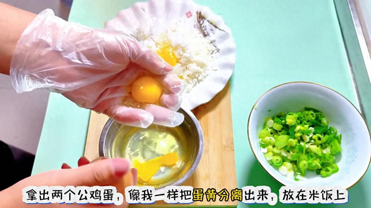 ·拿出两个公鸡蛋,像我一样把蛋黄分离出来放在米饭上。