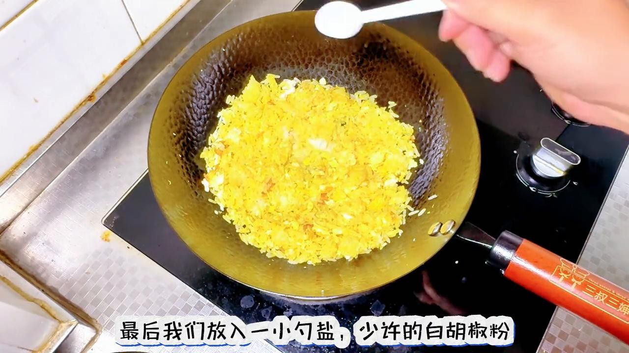 ·最后放入一小勺盐,少许的白胡椒粉。白胡椒粉可以很好的去除鸡蛋的腥味并增香,它不会导致米饭的口感变辣,大家可以放心。