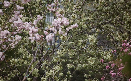 晚樱花瓣多达30-50枚,花叶同放,花期可达7-10天。玉渊潭公园的晚樱以重瓣品种为主,包含关山、松月、普贤象、郁金等品种。其中,关山樱以深粉色重瓣花朵闻名,花团直径可达5厘米,盛开时如层层锦缎堆叠枝头;松月樱呈现淡粉与纯白交融的渐变色调,花枝低垂如流苏摇曳;普贤象“待机”时间长,开花过程中颜色变化丰富;稀有品种郁金樱以黄绿色花瓣独树一帜,在粉色花海中显得尤为清雅。