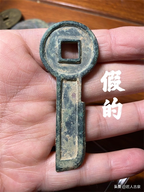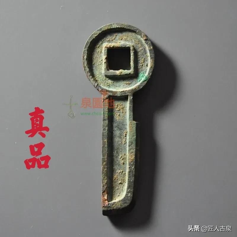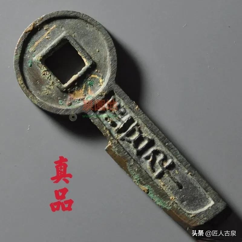 上面这一枚为仿品,钱体锈色单一没有层次感,文字便生硬,真品“一刀”这两个字本应该用黄金的,假的这一枚用的是合金的