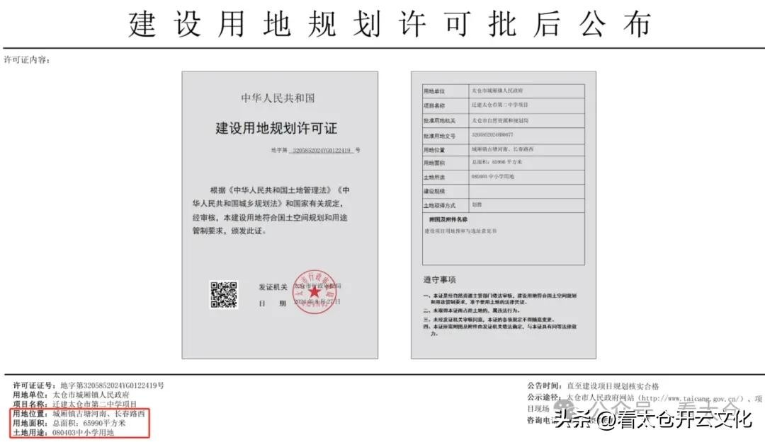 2024年8月份,太仓市人民政府网发布了关于市二中迁建的建设用地规划许可批后公示文件。《建设用地规划许可批后公布(迁建太仓市第二中学项目)》