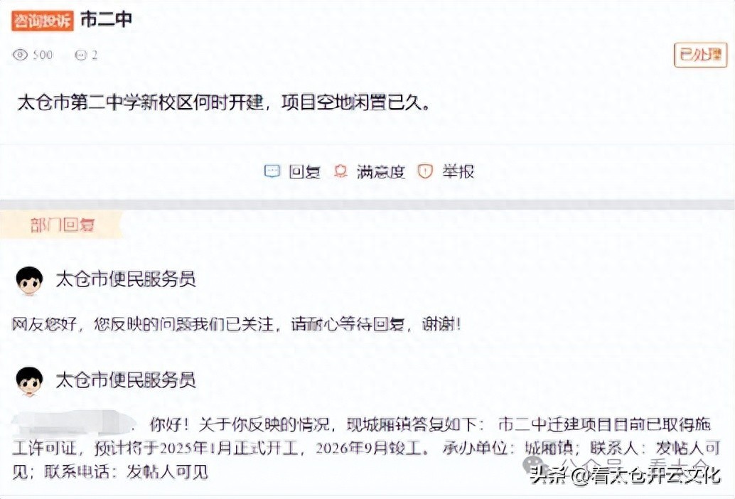 你好!关于你反映的情况,现城厢镇答复如下:市二中迁建项目目前已取得施工许可证,预计将于2025年1月正式开工,2026年9月竣工。