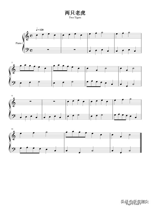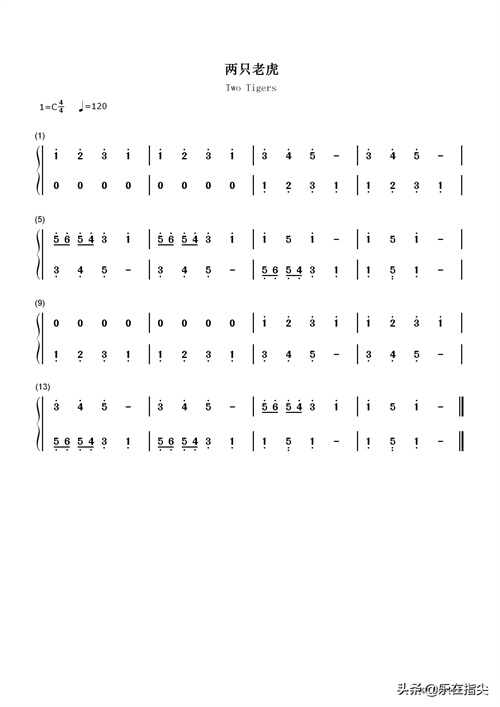 两只老虎经典儿歌。该版本的两只老虎弹奏时两只手分别弹奏旋律,它不同于旋律和伴奏的关系,两只手都要弹清楚,要注意掌握力度,两只手都要弹清楚,声音要结识。