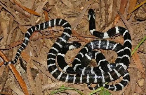 银环蛇身体白环和黑环相间排列,白环较窄,尾细长,体长1~1.5米之间。银环蛇在农村俗称过基峡、寸杆蛇、白节黑、金钱白花蛇、银甲带、银包铁等。毒性极强,为陆地第四大毒蛇。银环蛇生活在平原、山地或近水沟的丘陵地带,常出现于住宅附近。昼伏夜出,喜欢在湿润的路上或水边石缝间捕食黄鳝、泥鳅、蛙类或其他蛇。银环蛇毒性,银环蛇毒液中所含毒素,主要成分为蛋白质和多肽,以神经毒素为主。患者被咬时不但不会感到疼痛,反而会想睡觉。轻微中毒时身体局部产生麻痹现象,若是毒素作用于神经肌肉交接位置,则会阻绝神经传导路线,致使横纹肌无法正常收缩,导致呼吸麻痹,作用时间约40分钟至2小时,或长达24小时。几乎可以说死亡率非常高,即便是使用了抗神经毒素的血清也可能会身处危险之中。