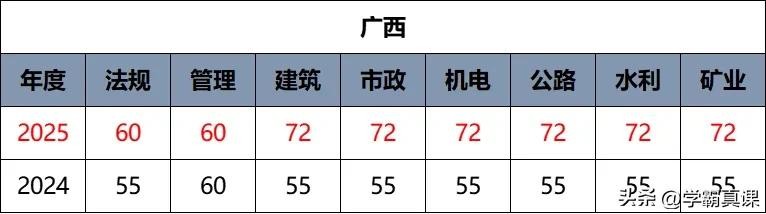 目前已有五个地区公布了今年二级建造师的合格标准。其中,江苏、重庆和海南的标准保持不变,而广西和湖北则有所提高,特别是广西的实务科目一下子提升了17分。