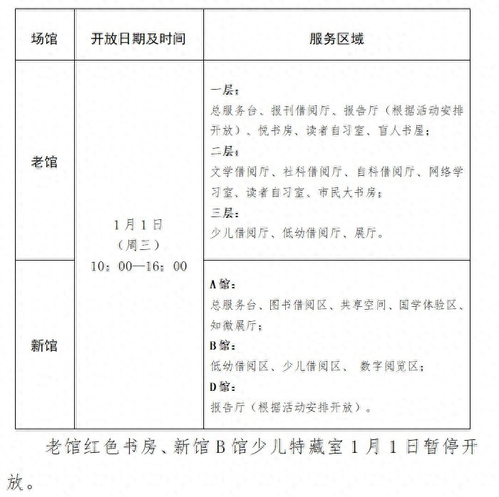 根据《国务院办公厅关于2025年部分节假日安排的通知》(国办发明电〔2024〕12号)精神,结合我馆实际,元旦假日,石家庄市图书馆新老两馆开放安排如下:
