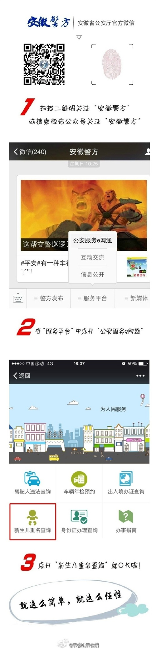 日前,中国首份姓名大数据报告出炉,整理了2015年540万新生儿姓名数据、2010后2000万姓名数据,分析中国父母最爱给宝宝起什么名,是国内首份关于名字的全景式报告……想让你家宝宝有个与众不同的名字吗,其实很简单,“安徽警方”微信公众号开通了新生儿重名查询,快来扫码关注吧。