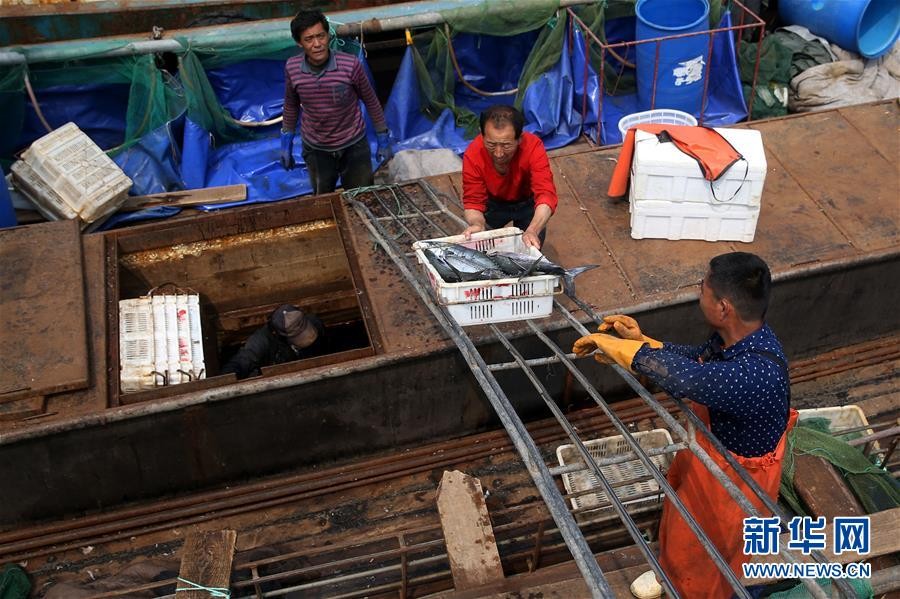 在青岛沙子口中心渔港,渔民从渔船上卸下休渔前的最后一批鲅鱼(4月30日摄)。 5月1日起,我国渤海、黄海、东海及北纬12度以北的南海(含北部湾)海域进入伏季休渔期。 新华社记者李紫恒摄