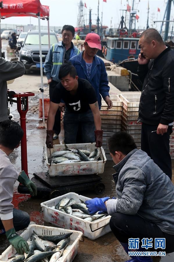 在青岛沙子口中心渔港,渔民在交易休渔前的最后一船鲅鱼(4月30日摄)。 5月1日起,我国渤海、黄海、东海及北纬12度以北的南海(含北部湾)海域进入伏季休渔期。 新华社记者李紫恒摄