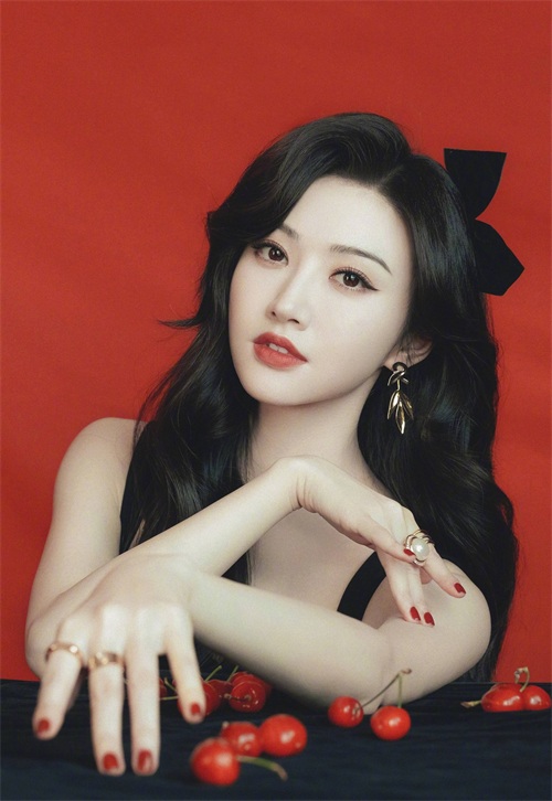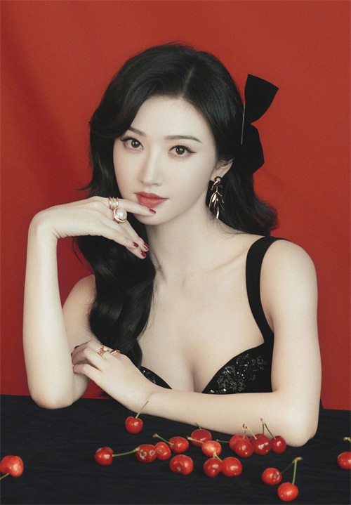 景甜手拿樱桃,宛如芭比娃娃般精致。