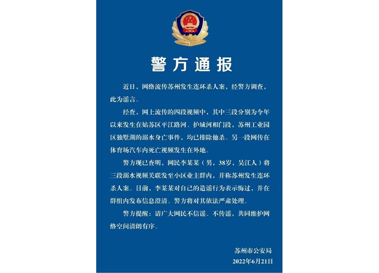 央广网苏州6月21日消息(记者郑楚豫)近日网络流传苏州发生连环杀人案,6月21日苏州警方发布官方通报,澄清该消息系谣言。对于造谣者,苏州警方将进行严肃处理。