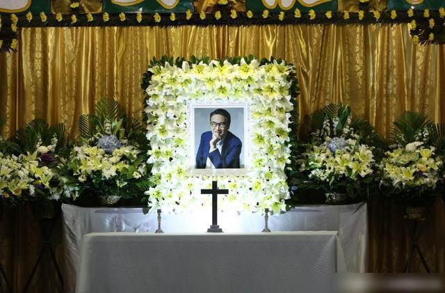 灵堂以简洁为主,横匾写着“主怀安息”,遗照上的吴孟达身穿宝蓝色西装以左手托下巴,笑容祥和。吴孟达有3段婚姻,遗照前方也摆放了现任妻子侯珊燕与子女的心型花圈,以及首任妻子麦莉莉和两个女儿的花圈。
