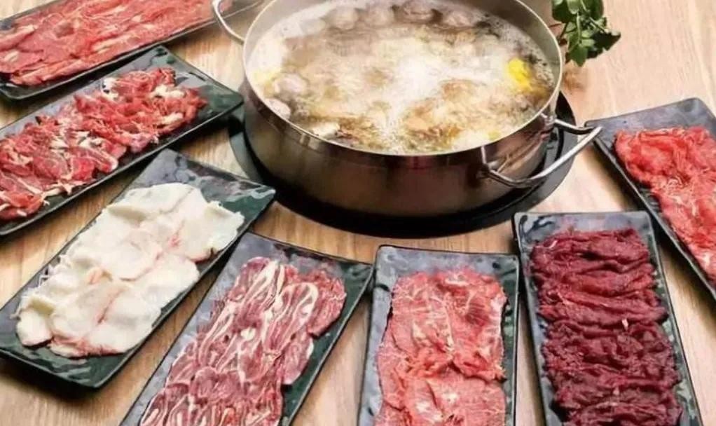 1:将牛肉洗净,沥干,切成大薄片;毛肚分开叶片,洗净后改刀成片,牛筋洗净,改成条,入清水中漫泡片刻,牛腰洗净,去腰,片成片,放入清水中漂净血水,牛肝去筋膜后洗净,切片,海带洗净,切成片,土豆,白萝卜去皮,冬瓜去皮,三者均洗净后切片,莴笋叶洗净。所有材料均分装入盘中,围摆在火锅四周。