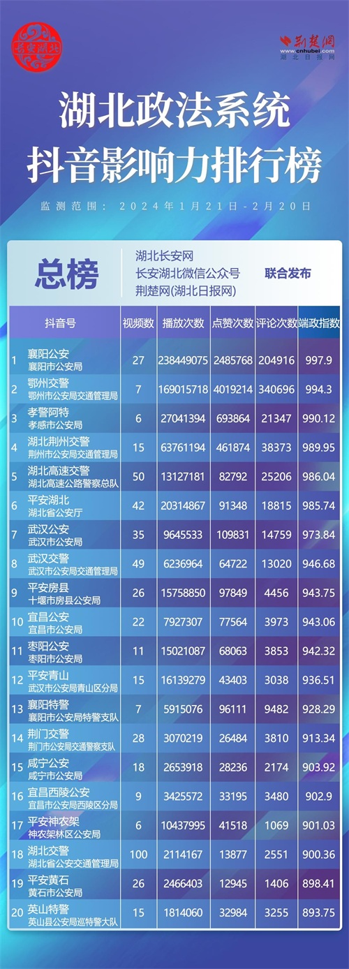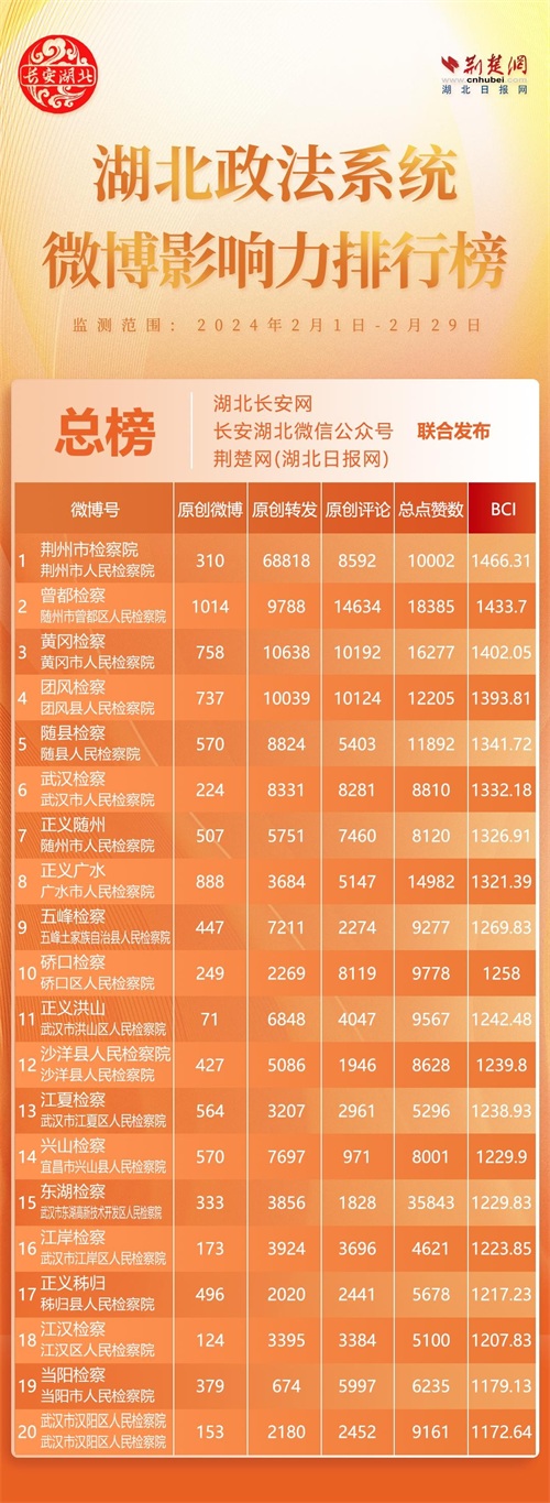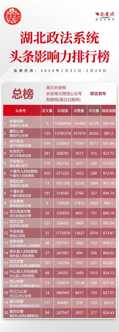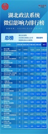 3月15日,湖北省委政法委官网湖北长安网、官微长安湖北,联合荆楚网(湖北日报网)、楚天舆情数据研究院发布湖北政法系统新媒体影响力排行2月榜单。具体榜单如下: