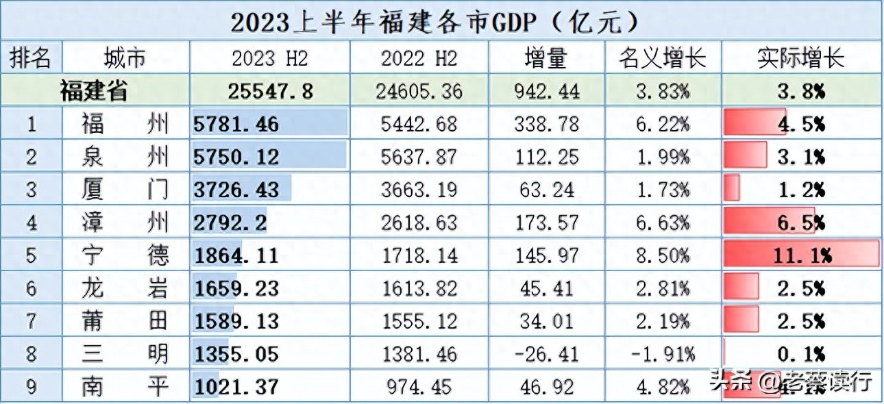 宁德GDP以11.10%的增速遥遥领先,漳州增速6.50%,跑赢全国;福州(4.50%)、南平(4.10%)增速低于全国水平、高于全省;厦门增速3.80%,与全省持平;其余泉州(3.10%)、龙岩 (2.50%)、莆田(2.50%)低于全省,而三明增速仅0.10%,名义增速为-1.91%。