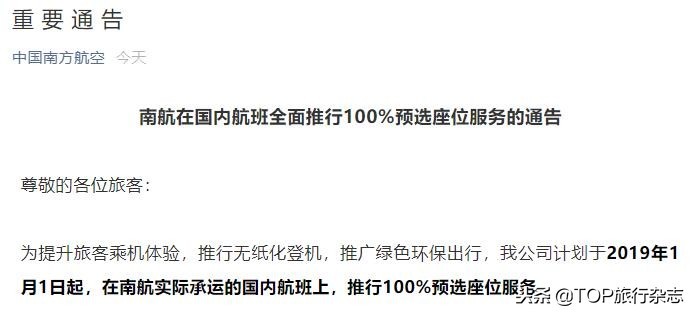 11月27日,中国南方航空微信公众号发布重要通告称,为提升旅客乘机体验,推行无纸化登机,推广绿色环保出行,南航计划于2019年1月1日起,在南航实际承运的国内航班上,推行100%预选座位服务。
