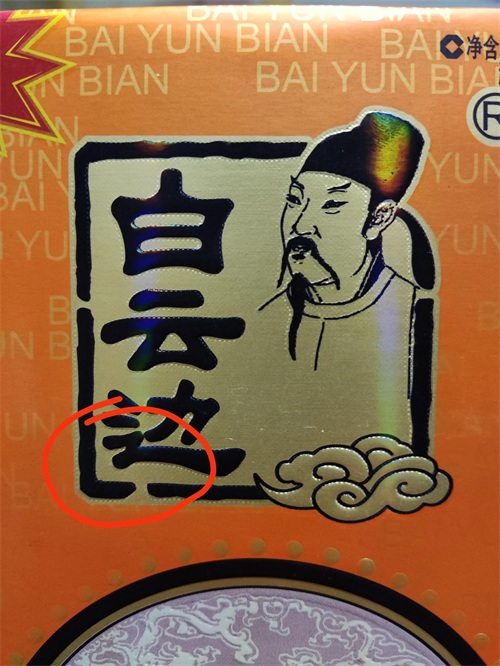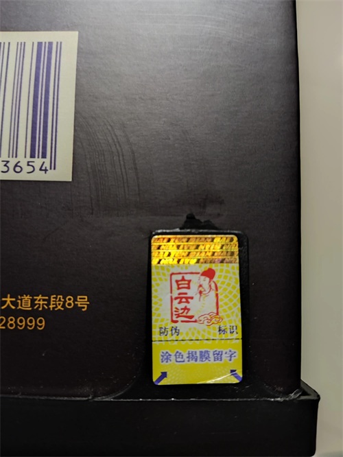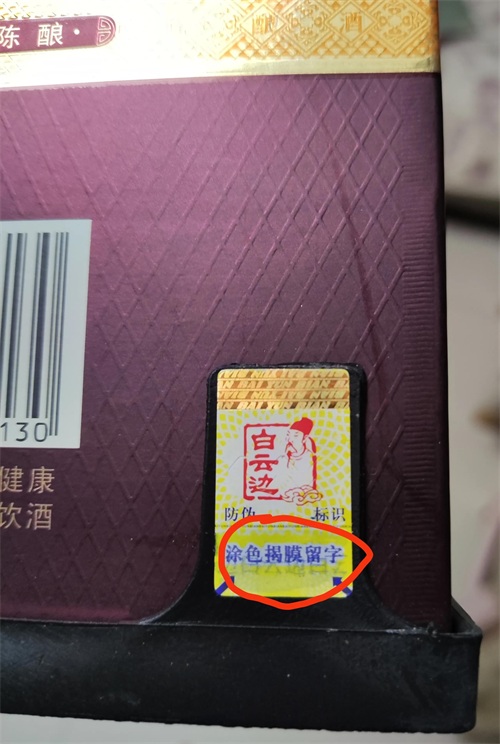 然后就是防伪标识的地方,大家可以用水性笔自己描一下,会出现清晰的白云边三个字,假的模糊不清