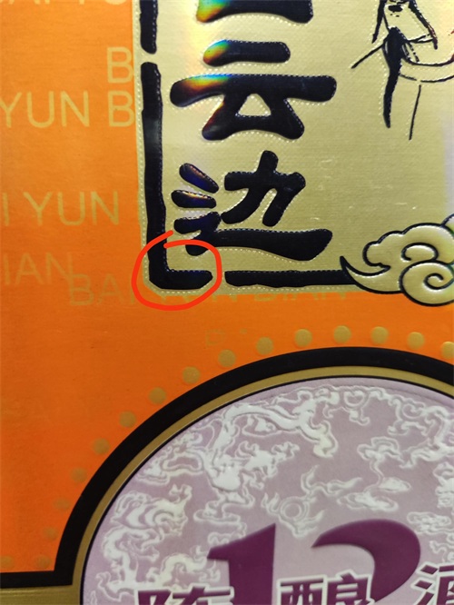 首先看下图圈中的地方,白云边三个字的左下角边框处,有一个小突起,这是白云边的一个暗记,真的白云边才有的