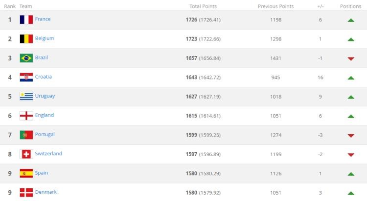 世界杯亚军得主克罗地亚队则上升16个排名,以1643的总积分排名世界第4,这也追平了其历史最佳排名。在世界杯同样表现出彩的乌拉圭和英格兰分列榜单第5、6位。