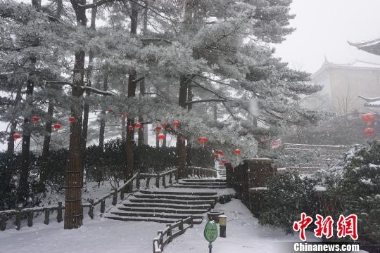 山上迎新春悬挂的红灯笼在皑皑雪中格外醒目。 黄山风景区供图 摄