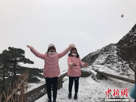 游客在黄山冬雪中嬉戏。 汪钰 摄