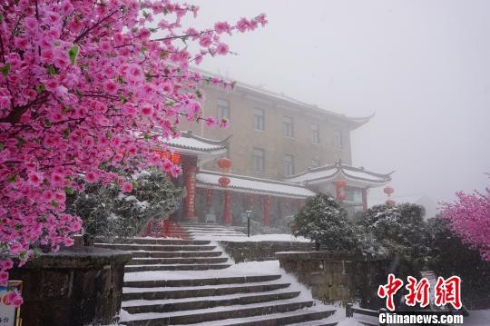 山上迎新春的装饰花与白雪“争春”。 黄山风景区供图 摄
