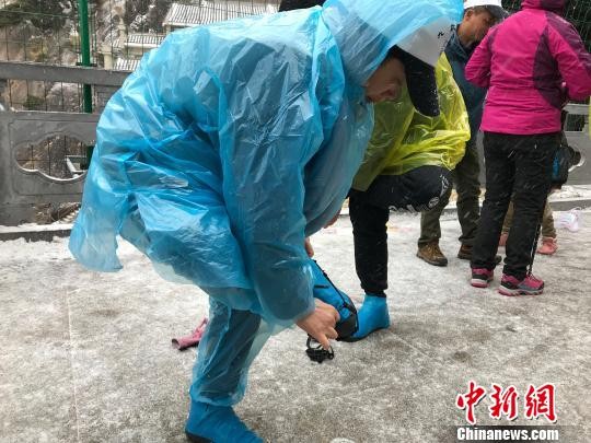 游客穿着雨衣、钉鞋上山。 汪钰 摄