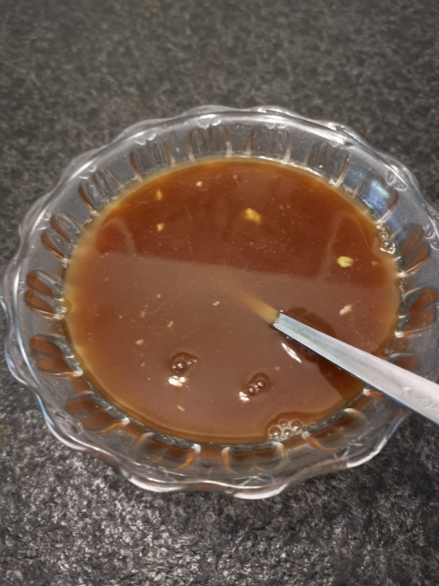 一勺蒜末、少许盐、两勺生抽、一勺蚝油、半勺米醋、半勺白糖、少许鸡精、一勺玉米淀粉、半碗清水,搅匀。