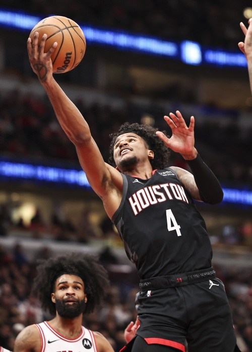 1月10日,公牛队球员卡鲁索(右一)在比赛中防守火箭队球员申京(右二)。 新华社发(乔尔·莱纳摄)