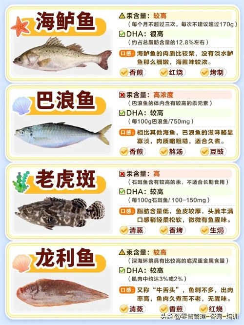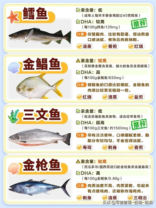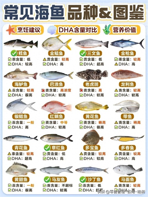 鳕鱼、金鲳鱼、三文鱼、金枪鱼、海鲈鱼、老虎斑、龙利鱼、银鲳鱼、黄花鱼等都在图片里面了介绍了。
